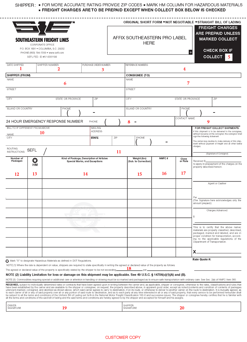 Hold cursor over red numbers, or click, to show more information pertaining to that section of the bill of lading.